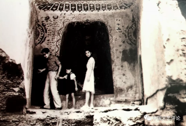 1940年代,常书鸿、常沙娜、常嘉陵(弟)在莫高窟合影