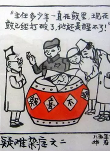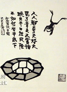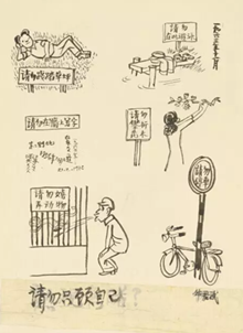 华君武(1915—2010),原名华潮,1940年4月加入中国共产党。1942年与蔡若虹、张谔合办《讽刺画展》,曾受到毛泽东主席的接见。较有代表性的作品是:《诱降》、《榜样》、《肃清贪污游戏》、《就位》、《准时到会的同志》等。