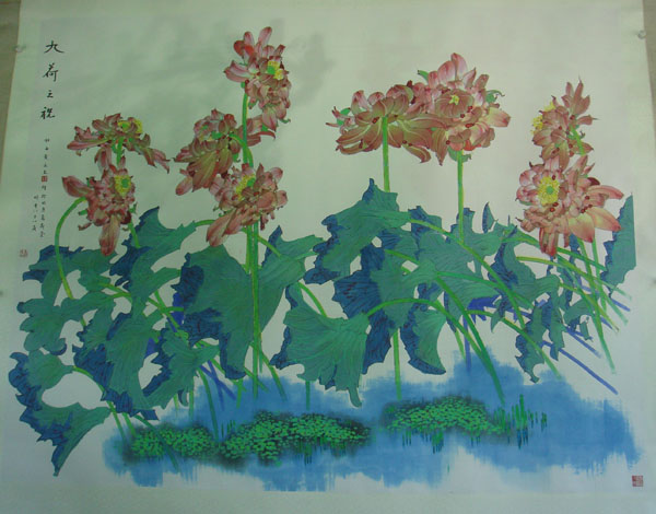 九束在风中傲然挺立的红荷,大气凝练、色彩艳丽的画面,装裱后高5.13米、宽3.97米的尺幅……5月27日,北京通州万荷堂,著名画家黄永玉为庆祝中国共产党成立90周年美术作品展览专门创作、象征中国共产党历经风雨依然生机勃勃的巨作《九荷之祝》,让前来取画的中国美协相关负责人和随行的本报记者禁不住发出阵阵惊叹。