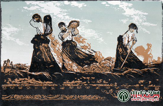 这一时期他创作的《初踏黄金路》更是扛鼎之作。他从劳动生活中提炼出传世的经典形象,从多年积累的速写中体会到藏族妇女背水、打酥油的形象,她们特有的体型和美感,在原生态的集体舞蹈中展示出悠久的文化和特质。藏族妇女牵着驮满青稞的牦牛回家,劳动的悠远歌声,显示了民族的新生,喻义她们从此踏上黄金一样的路,并一直走下去。
