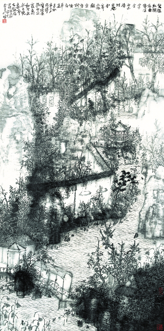 何加林的写生山水,在“满”中逼出一种孤冷之感,先自对寒山寒林有一种诗意的体察。这种体察,并非刻意地构划,而是将自己化作那一树一山来琢磨自然本有的生机。待到表现之时,那笔却又是率性的,甚至是随心所向的。在干湿皴擦之间,尽显挥洒和跳脱;于笔墨的丰润中,展露一派盎然生机。冷而雅,黑而润,变化而富生机,饱满而不失空灵。我们随着何加林的笔墨,在月色湖山中行走。