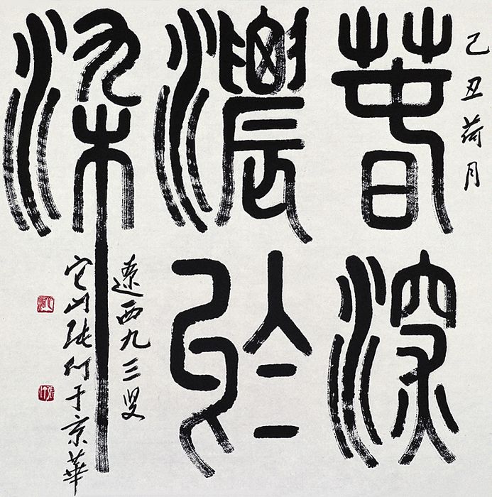 篆书是晚年时张仃每天都要做的功课,但是就书写内容来看,张仃并非是信手拈来毫无根据,而是在灰娃女士的帮助下,认真地梳理、整合古人的哲理名言和历朝的文学经典。在创作时又加入自己的理解和加工,就篆书作品书写的内容来看,也是对当今传统文化缺失情景下的一种普及和推广。展览的第一部分“天人之际”为先秦诸子著述及历代诗文中流传久远的经典论述,从中折射出古人传统的宇宙观与人生观;第二部分“古今之变”主要为各朝咏史抒怀,凭吊古今之作,反映古人的历史观;第三部分“四时行焉”讲述四季的轮回与自然的兴衰,主要选取的是古典诗文中咏叹四季的名句。所以在这次展览中,主办方对这批书法作品的释文与出处进行了详细认真的考据工作。在方便阅读的同时更好地拓宽了展览的外延,使得这次张仃的书法艺术展不仅仅具有艺术的可观性,更加具备了文学上的可读性。