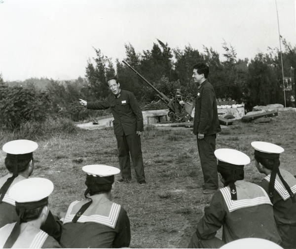 中央慰问团海政文工团常宝华、洪胜在广西前线炮兵阵地上为战士们演出 王立成摄