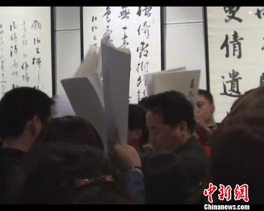 众多粉丝高举姜昆的书法作品集,把姜昆围了里三圈外三圈,以求姜昆的墨宝。