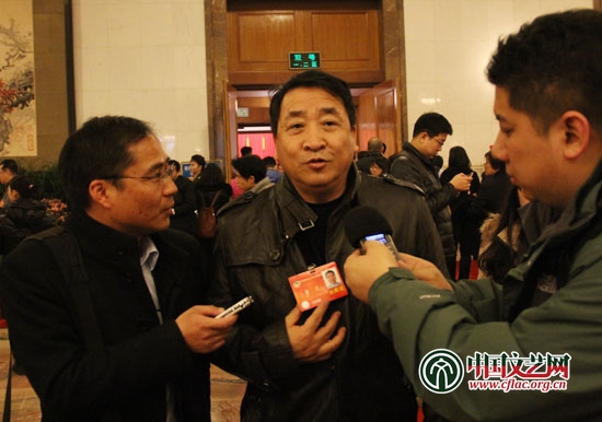全国政协委员、曲艺家姜昆刚走出会场就被记者围住了。中国文艺网 丁薇 摄