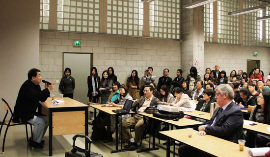 演讲由巴黎七大孔子学院中方院长周汉斌先生主持,中国驻法国使馆金春雷新闻参赞及姜昆的法国友人一同参加并聆听了整场演讲.