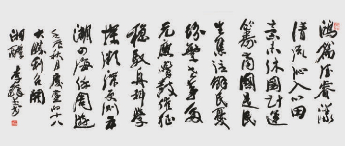 中国文联荣誉委员、中国书协顾问李铎11月8日专程到中国文联机关收看党的十八大开幕式,聆听胡锦涛总书记的报告后,他十分激动,随即赋诗一首《庆祝党的十八大胜利召开》并激情挥毫。释文:鸿篇德睿漾清流,沁入心田意未休。国计运筹商国是,民生集注解民忧。纷繁世事多元应,击鼓催征稳驭舟。科学探微深更测,五湖四海任周游。——壬辰秋月,庆党的十八大胜利召开!湘醴李铎并书。