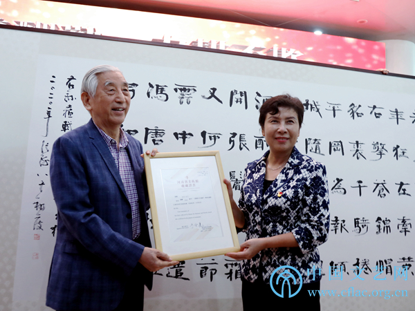 8月30日,“天道酬勤 力耕不欺 ——张海八十初度新作展”在河南郑州开幕,图为张海向河南省美术馆捐赠作品,河南省文旅厅厅长宋丽萍接受作品并为张海颁发收藏证书。中国文艺网 韩雪竹摄 本次展览共展出张海新作80余幅,作品涵盖篆、隶、楷、行草诸体,风格多样,取法不一。张海篆书追秦汉古韵,意到便成;隶书旁参汉简,兼收并蓄;楷书钟情于《张猛龙碑》,刚健有力;行草书清逸脱略,简练大方。 8月30日,“天道酬勤 力耕不欺 ——张海八十初度新作展”在河南郑州开幕,图为与会领导嘉宾参观展览。中国文艺网 韩雪竹摄 8月30日,“天道酬勤 力耕不欺 ——张海八十初度新作展”在河南郑州开幕,图为展览现场。