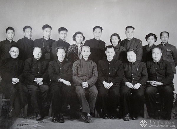 1957年,第一届全国摄影艺术展览的评选委员和工作人员。前排自左至右:刘旭沧、黄翔、张印泉、蔡俊三、石少华、吴印咸、郑景康。后排:卢学志、陈正青、陈勃、高帆、彭高瑞、薛子江、秦淑兰、吴寅伯、白瑛、杨子颐。