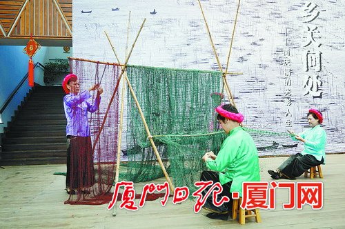 四位疍民装束的老妇人围在竹竿支起的渔网边,手拿梭子麻利地织网。她们身后是一片波光粼粼的海面,有打渔的小船恰好经过……这是简庆福作品里的场景。前天上午,“乡关何处:简庆福的光影人生”摄影展在厦开幕,承办方中华儿女美术馆特别还原了旧时厦门港的经典渔家场景,以此来回应简先生剪不断的乡愁。