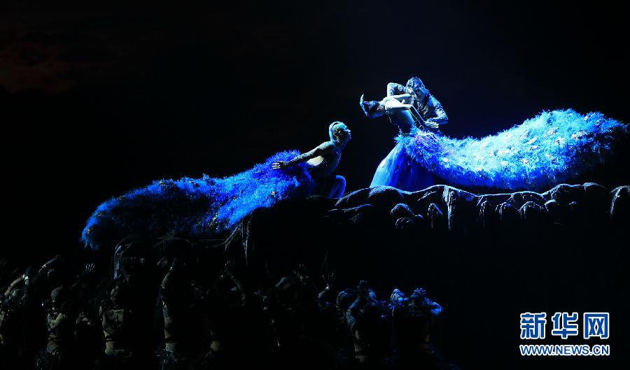 当日,著名舞蹈家杨丽萍舞台生涯的谢幕作品——大型舞剧《孔雀》在天津大礼堂上演,该剧分为春、夏、秋、冬四个篇章,倾注了杨丽萍对自然、艺术、生命、身体、生活等方方面面的经验和感受,堪称其四十年舞蹈艺术的精华沉淀。 新华社发(马宬 摄)
