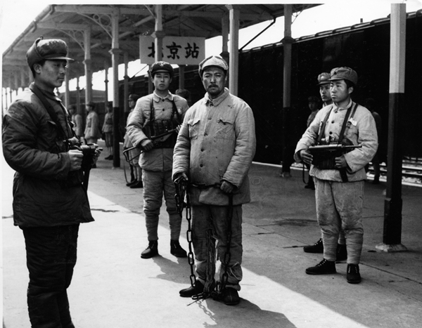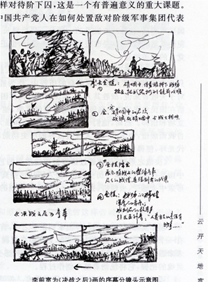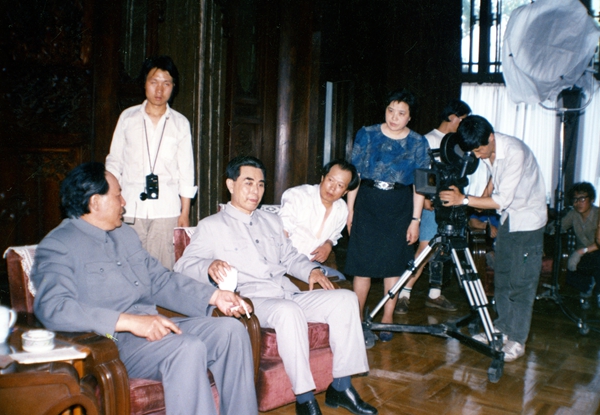 李前宽、肖桂云导演在中南海颐年堂拍摄电影《决战之后》。图中右一是拍摄师马德林,右二是肖导演,右三是李导,左一是毛泽东扮演者古月,左二周恩来扮演者黄凯。