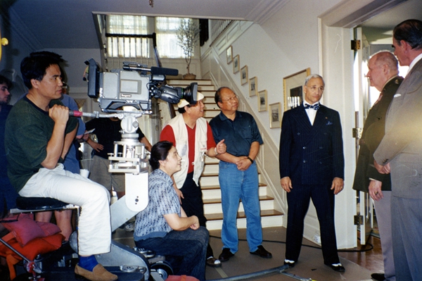 1999年,电视剧《抗美援朝》拍摄现场,李前宽导演夫妇与扮演麦克阿瑟和沃克将军的美国好莱坞演员在一起说戏