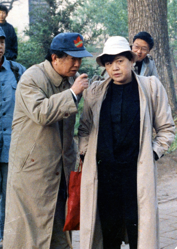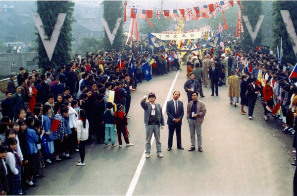 1992年,电影《重庆谈判》胜利大游行现场。图为李前宽导演在指挥,旁边是作家张笔天、黄济人