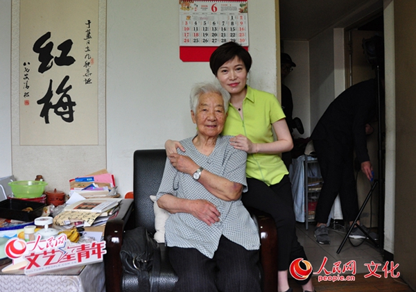 于蓝老师在客厅里等候着我们,白底黑点的短袖衫,黑色细条纹西裤,简朴的衣着,让老人看起来神清气爽。见我们来了,于蓝老师脸上露出温和的微笑,高兴地拉着我的手聊起天来:“我今年已经98岁啦,前不久眼睛刚做过手术,所以老要滴眼药水……腿脚、耳朵也不太好了,一会我要是听不清,你就凑到我跟前说吧。”我特意把5年前的专访报道带给于蓝老师看,老人很开心,拿起放大镜边看边问,“这个能送给我做个纪念吗?”