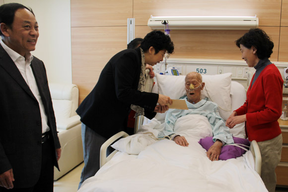 4月23日下午,中国文联党组书记、副主席赵实,党组成员、书记处书记夏潮,中国影协分党组成员、副秘书长谢力来到北京协和医院,看望大病初愈的百岁影人于敏,并庆贺他的百岁寿诞。