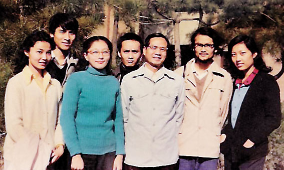 杜鸣心和他的学生们(右一:刘索拉,右二:瞿小松,右三:杜鸣心,左二:叶小纲,左三:鲍晋书,左四:李滨扬)
