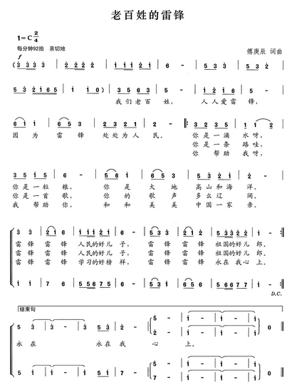 在纪念毛泽东“向雷锋同志学习”题词50周年之际,雷锋精神应当赋予它何种新的涵义?傅庚辰再一次踏上抚顺这块热土,这次他又去了雷锋班和展览馆,去探望了乔安山,重温了那些故事,他还见到了当代雷锋郭明义,很有感触。在雷锋的故地,傅庚辰和郭明义以及他的工友一起高唱《雷锋,我们的战友》。傅庚辰说:“郭明义穿一身工装,满面风尘。学习雷锋,我们应该怎么做呢?郭明义说,‘老百姓需要什么我们就给他,他有病,我们就帮他看病,他没钱我们就给他钱,他有什么困难就帮他解决。’郭明义的话很朴实,但是很让我感动。而且他也真的这样做的,他的工资还没拿回家就都给别人了,和他一起的还有一支2000人的学雷锋团队。”这一次创作,我应该选择什么角度呢?傅庚辰又一次陷入思索当中,“虽然我们现在生活在新的时代,但是我们的传统不能丢,雷锋精神不能丢。共产党的根本宗旨就是为人民服务,这是不可丢弃的传统,是必须要继承和发扬的。党内之所以出现了腐败的现象,就是因为他们背弃了共产党的传统。就像雷锋说的那样,‘人的生命是有限的,可是为人民服务是无限的,要把有限的生命投入到无限的为人民服务之中去。’语言虽然浅显但蕴含的道理十分深刻。”有一天凌晨四点钟,就像当年一样:“我们老百姓,人人爱雷锋,因为雷锋处处为人民……”这些歌词浮现在傅庚辰的脑海里,这次的曲调,是亲切的,轻柔的,像在话家常一样。傅庚辰说,“我这次选的是老百姓的视角,容易上口。‘你是一滴水、你是一颗粮,你是大地高山和海洋。你帮助我,我帮助你,和和美美中国一家亲。’这些话突然就从我的心里冒出来了。一人唱一句,像在对话一样,十分亲切,最后高潮部分再合唱。相比起豪迈、雄壮的《雷锋,我们的战友》,这首《老百姓的雷锋》更口头、通俗,符合现在时代的基调。我们提倡为人民服务,就要用老百姓的语言、老百姓的口吻,唱出老百姓内心的感情呼唤。这样才叫贴近群众,也更容易引起共鸣。”