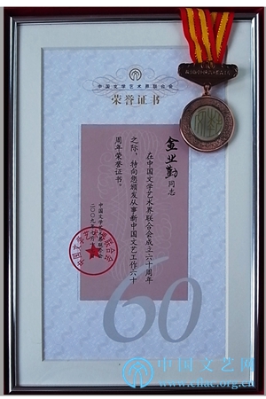 金业勤获得中国文联颁发的“从事新中国文艺工作六十年”荣誉证书