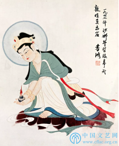 1947年,常沙娜临摹敦煌壁画,上有常书鸿题字