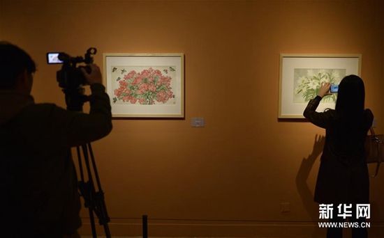 3月8日,两名媒体记者在中国美术馆参观拍摄展出的常沙娜作品。新华社记者 鲁鹏 摄