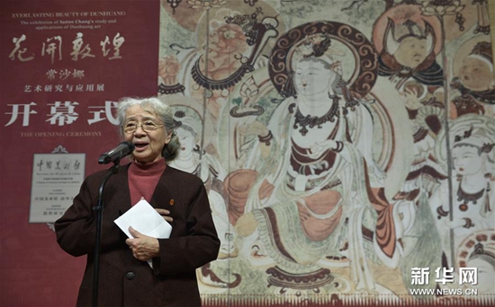3月8日,常沙娜在展览开幕式上致辞。新华社记者 鲁鹏 摄