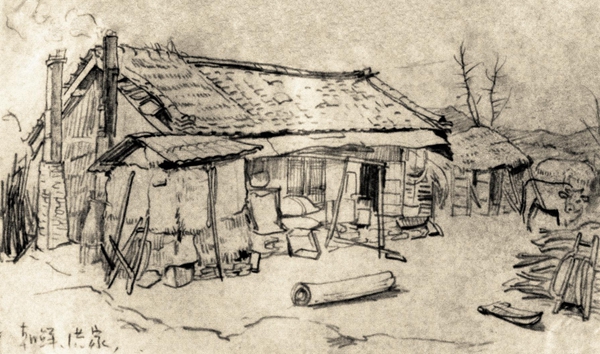 侯一民速写《朝鲜北部农家洪家》1950年