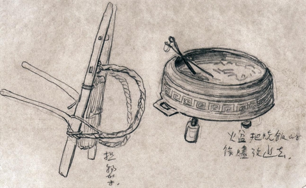 侯一民速写《朝鲜北部农家的火盆和担物架》1950年