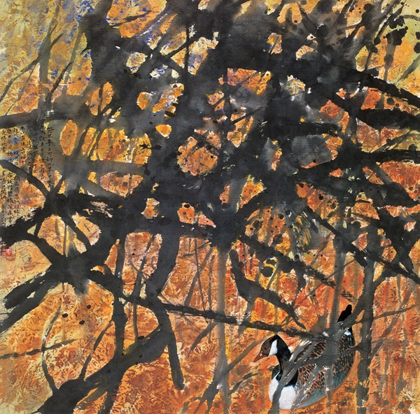 1973年作 秋林野鸭 镜心 作品尺寸:102.5×10.25cm 设色纸本