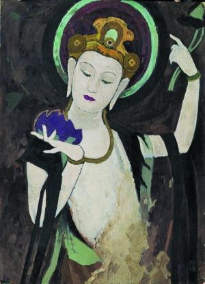 靳尚谊表示,临摹作为重要的方法,可以着重解决色彩问题,而这也使得临摹图片或照片会有很大的局限。于是,靳尚谊特意去了敦煌临摹壁画,直面古代的原作,用写实的方式把敦煌那些已经氧化破损、被烟熏黑的图像以及墙上斑斑驳驳的景象描绘出来。在余丁看来,“这几张敦煌壁画的临摹本,是迄今比照片及其他摹本更接近壁画原作的图像。”