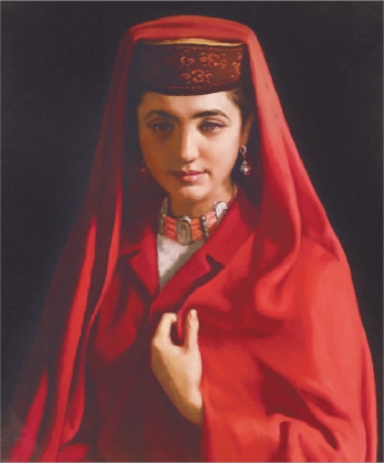 靳尚谊于1983年创作了两件几乎完全相同的《塔吉克新娘》 ,二者只在画中“新娘”佩戴的项链细节上有细微差别。创作较早的一幅作品中,“新娘”佩戴的项链上装饰有三排珠子,此画完成不久便参加了当年的“中央美术学院教师作品展” ,且广受好评,于同年被中国美术馆收藏。第二幅随后创作,亦完成于1983年。它与中国美术馆所藏版本唯一的区别为,“新娘”佩戴的项链上嵌有四排珠子。这两幅《塔吉克新娘》在创作面貌上均十分完美,而同一幅作品的反复创作也足见艺术家对于此作的重视和喜爱。靳尚谊采用侧光来捕捉形体结构和色彩的丰富层次,强烈的明暗反差一方面加强了人物体积的充盈之感,一方面也使得画中人所着的红色嫁衣渐隐于深色背景,虚实结合中营造出强烈的艺术效果。画家巧妙运用西方古典主义的写实手法,用小笔触细腻地点绘出“塔吉克新娘”丰腴、结实而立体的面部轮廓,并加强了艺术处理的主观性以突显画面的生动。