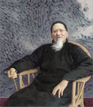“上世纪80年代,在天津博物馆看到范宽的作品,靳先生又开始思考油画这种源于西方的古典技法如何表现中国文化的主题, 《青年女歌手》的背景选择的就是范宽的《雪景寒林图》 。 ”余丁说,“另外两张以黄宾虹为人物的画作中,他更是尝试以油画这种绘画语言来表现中国水墨画的质感。进入上世纪90年代,在翻阅黄宾虹的画册后他发现,其笔墨抽象性很强,既有中国的传统又有时代意识。为此他又做了3次实验:先后画了两张《黄宾虹》 ,一张是黄宾虹在山水之间,手拿一个速写本;另一张画的是晚年的黄宾虹,背景是黄宾虹自己的画;第三次实验则是《髡残》 ,画面中髡残置身山水之中,表现他晚年在南京出家后的状态。从这些实验中,中国画的意境和笔墨趣味完全借助油画语言来表达。 ”