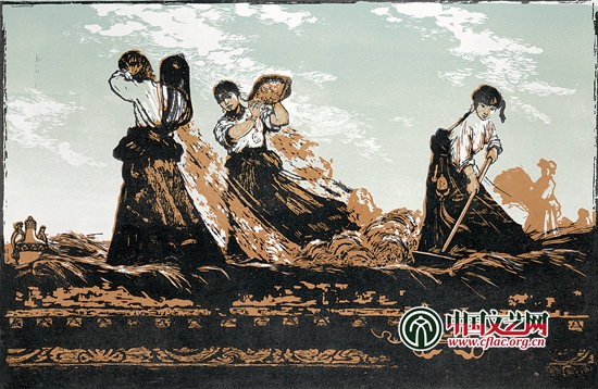 深得下去、扎得下根,不断思考、不断创作,这既是李焕民先生艺术人生的写照,也是他为后学做出的榜样。记得我到四川省文联工作后的第一个春节,去李焕民先生家看望他,已八十多岁高龄的老人家正在操刀创作巨幅版画《守望》,作品已近尾声,见我到来,寒暄一阵之后就把分刻的两块板合到一起,让我给作品提点意见,看老人家如此真诚谦逊,便仔细打量起作品来。只见一位身材健硕的藏族美女迎风而立,左手将酥油茶桶挂在肩上,右手搭棚式挡住耀眼的太阳光,充满深情、充满希望地遥望远方……作品将“中国梦,人民的梦”这一主题通过一个在阳光下展望前方的藏族妇女表现得淋漓尽致,我看后当即向他表达了对作品的高度赞赏。但李焕民先生还是非要找不足,于是我小心翼翼地说:以我在藏族聚居区工作生活了10年的观察,当肩上负重时身体上半部要略为前倾,因此建议在腰部有一点向后展的表现。他一听便说好好好,而且后来真按我所提的建议做了改动。这幅版画作品《守望》在参加第十二届全国美展时,获得了创作奖银奖。每当看到这幅作品便对李焕民先生虚怀若谷、精益求精的态度油然而生敬意,让人永远难以忘怀。
