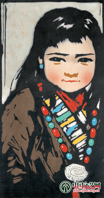 李焕民的代表作《藏族女孩》,将女孩处理成一幅肖像式的近距离特写,一下子吸引住观众的视线:他用水印木刻印出小女孩红润稚嫩的脸庞,长长的眉毛和深情的眼睛,以三角刀与大圆刀刻制的刀法,多变地处理发辫;又干脆遒劲地留下粗犷刀味,与表现女孩头部时精致的刀法形成鲜明对比。他用线条刻出的长命锁,用色传统而富有变化,突出了民族服饰的特色,准确地反映出女孩的神情,充分展示出水印木刻的技巧与艺术魅力。