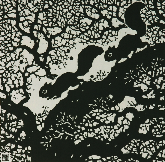 20世纪80年代的代表作品中,黑白木刻《林间》描绘了深秋时节积山林间松鼠跑跳嬉戏的景致,既表现了他对小松鼠的喜爱之情,也表现了生命的欢跃。“他出门时一定不忘的是他的速写本,画《林间》时,还在家里养了小松鼠,每天靠在笼子边逗它们,观察它们。”郝黎回忆父亲对待创作的一丝不苟,“我上小学后就开始给他做模特了;他想观察大襟衣的褶子,就让妈妈特别给我做了一套,让我靠在床上,他仔细看衣服上的褶子;他创作《学习》时,我拿着搓板装做洗衣服的样子,他就笑。”
