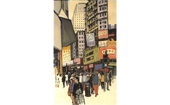 王琦对香港始终有一种无法割舍的情怀。在其晚年的创作中,我们意外地发现了两幅香港题材的作品:一幅为1995年创作的《系缆》,这是对其1950年同名速写作品的水墨画再创作,具有很强的抒情性。细细品味,《系缆》的再创作似乎具有深意:漂泊的渔船到岸,通过“系缆”回归大地母亲的怀抱,这不正指代了香港经过了百年漂泊终于要回归祖国的怀抱吗?另一幅是1996年创作的《九龙街头》(见图),他以速写的语言,描绘了现代香港繁华熙攘的都市街道。不同于钢笔速写的单色表现,王琦在这幅创作中加入了色彩,通过色彩的旋律与节奏的变化,来展现香港现代化都市的繁华面貌。跨越半个世纪,通过艺术,王琦再次与香港相拥。
