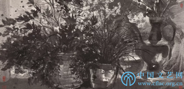 《窗前盆花(一)》 2000年 纸本 水墨 70×137cm