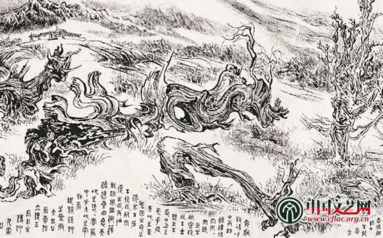 张仃所用的“线”,不仅仅是用毛笔来勾勒自然的客观形态,他的运笔遒劲从容、意态盎然,开合之间融入了篆书的意象与气韵,所以他的线条有书法的韵味和功底,而这种功底使他的“对景写生”具有中国艺术的高古苍浑和缈缈的意境。在绘画题材上,张仃更是将写实山水加以升华,把人文关怀、家园意识、英雄史诗和历史沧桑带入山水画,开辟了中国山水画艺术的新境界,焦墨山水得以在中国画系统中斐然成章。
