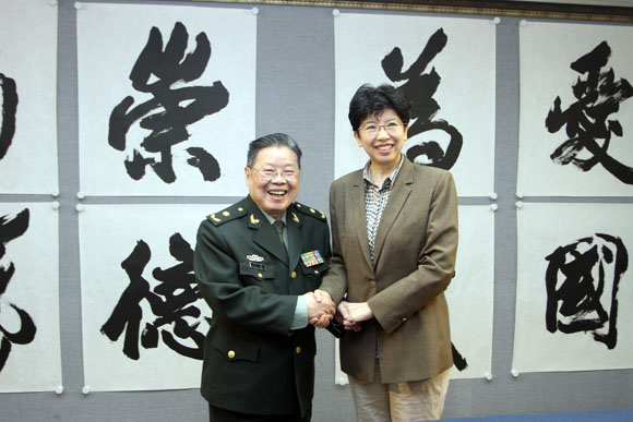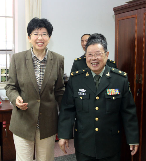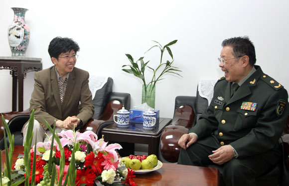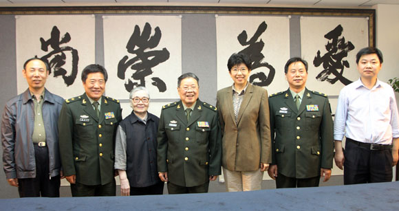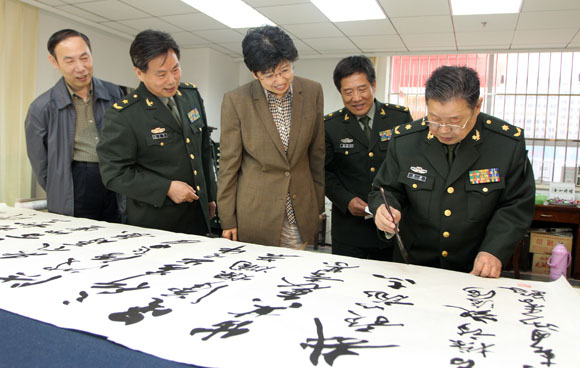 赵实和中国人民军事博物馆馆长陈士富、政委孔令义,中国文联办公厅主任夏朝华观看李铎现场创作。中国文艺网 余宁 摄