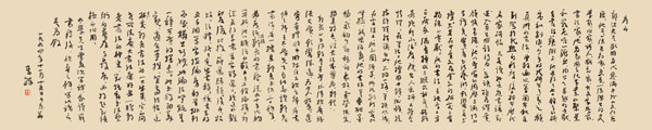 郭沫若是我国当代誉满中外的文化巨匠。他是一位革命家,更是一位杰出的史学家、作家、诗人、戏剧家、古文字学家、书法家,他为我国文化事业的繁荣和发展呕心沥血,做出了卓越的贡献。在书法艺术上,他进行了七十余年的研究和创作。少年时就研习王羲之、颜真卿的书法,曾数遍临摹《兰亭序》,达到驾轻就熟的程度,后又研习历代名家碑帖,尤喜读孙过庭《书谱》,对“逆入平出,回锋转向”要诀极为赞赏,领悟甚深。他以丰富的阅历与渊博的学识充实着书法艺术,影响着书坛。尤其在甲骨文及金文的研究上有特殊的贡献,他的书法,在结字上方正居处,偶有横式与纵式相参,虽显奇绝却不失法度,既出人意料,又符合情理;在笔法上,他善用中锋、侧锋,提按顿挫,挥洒自如,不拘一格,笔挟风涛;在写法上,他不囿绳墨,师法创新,变化无极,疏密得当。他的书作笔酣墨畅,气韵生动,坚劲豪放,气势恢宏,独具特色,被书法界尊为“郭体”。