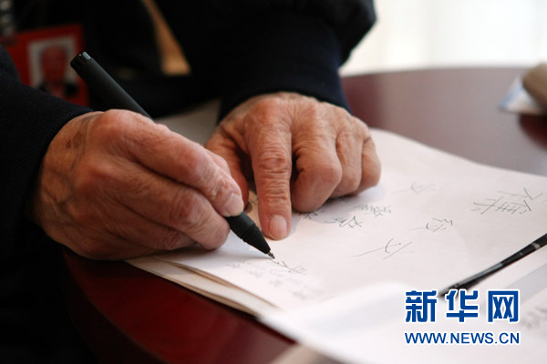 3月6日,新华网记者专访全国政协委员、著名书法家欧阳中石先生。图为欧阳中石先生动笔书写,图解文字的象形含义。新华网记者 杨理光摄