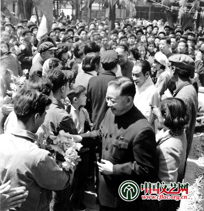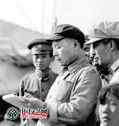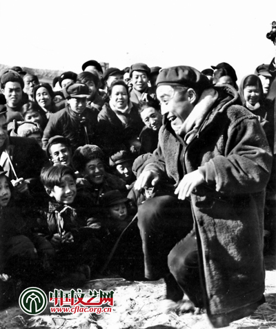 当时的中国文联主席是文艺大家郭沫若,副主席有周扬、茅盾,秘书长是阳翰笙等名家。他们遵照毛泽东同志关于有出息的文学家艺术家必须到工农兵群众中去、到火热的斗争中去、到唯一的最广大最丰富的源泉中去的教导,身先士卒下到基层。接着,一批批文艺家在文联的组织下纷纷走向农村和工地。如今,当我打开资料柜寻找这类老照片时,百感交集:在“文革”三次抄家中,许多名家在田间村头的珍贵镜头被造反派视为黑照片,抄走后作为罪证办了个黑影展,之后毁掉。而少数漏网的小样片事后不得不匿藏起来,经现代的数码扫描技术才得以恢复,当年的鲜活演出场景又一一显现在眼前。半个多世纪过去了,这些老镜头依然是新中国文艺史上的美好记忆和光辉篇章。