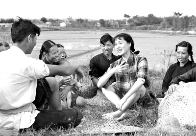 红线女(右二)在农村参加劳动,休息时教社员们唱革命歌曲(1963年摄)。新华社记者 孔凡根摄