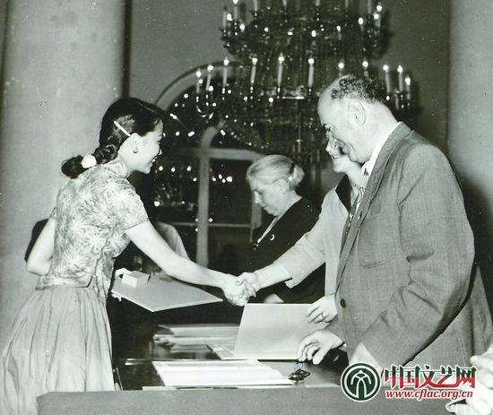 1957年红线女在莫斯科接受第六届世界青年联欢节东方古典歌曲比赛金质奖章