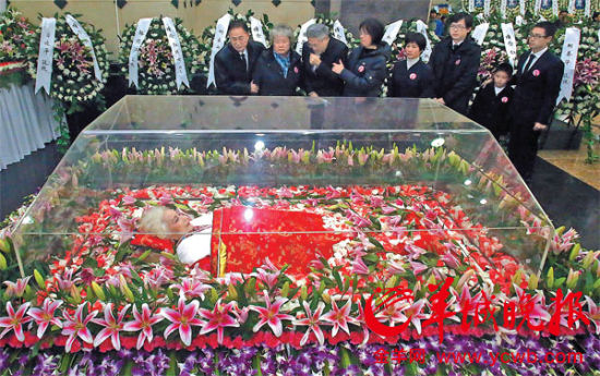 12月17日的广州殡仪馆白云厅散发着阵阵花香,红线女生前演唱的悠扬的粤剧在厅内萦绕,党和国家领导人及社会各界送来的花圈摆满了悼念厅,红线女安卧在鲜花丛中,彩色遗照的两边挽联写着:她的生命属于艺术,她的艺术属于人民。