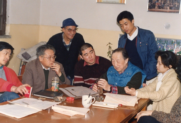 1989年北京人艺排演《巴黎人》工作照。导演为演员分析剧本。左起前排:濮存昕、顾威、张福元、欧阳山尊、郑天玮;后排:张瞳、张万昆