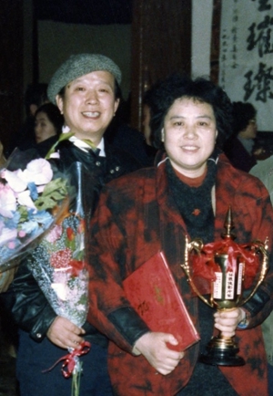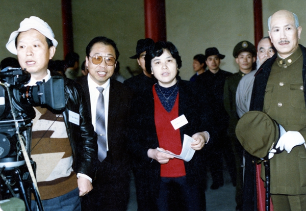 1989年4月21日,在南京总统府,电影《开国大典》导演李前宽、肖桂云与著名编剧张笑天合影