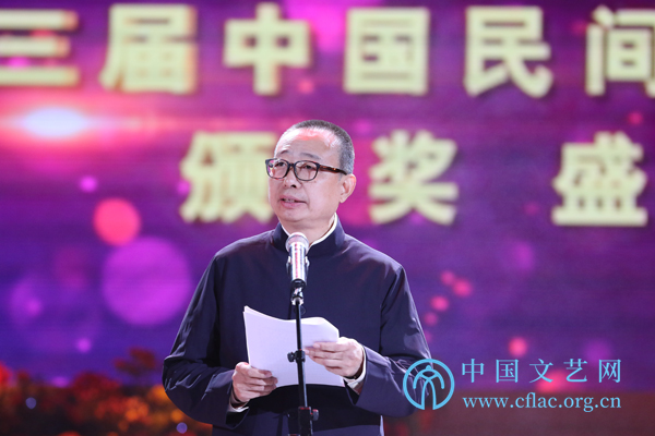 1月13日,“恰是山花烂漫时——第十三届中国民间文艺山花奖”颁奖典礼在广州举行。图为中国文联副主席、中国民协主席潘鲁生致辞。