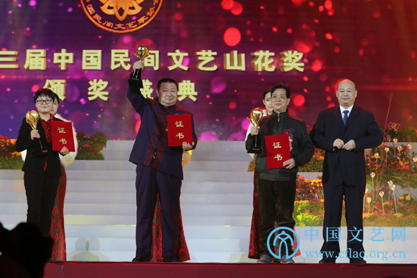 1月13日,“恰是山花烂漫时——第十三届中国民间文艺山花奖”颁奖典礼在广州举行。图为中国文联党组成员、书记处书记陈建文为“组委会特别奖”的获奖人员颁奖。