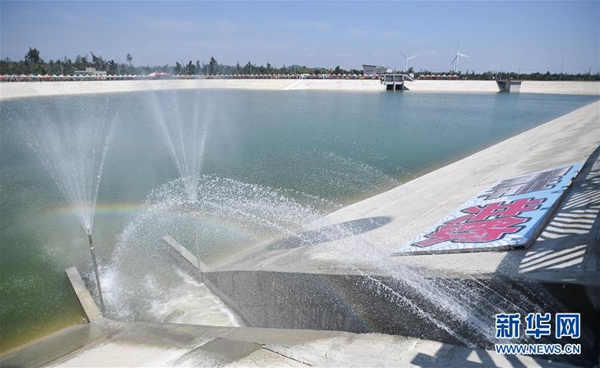 福建向金门供水工程实现正式通水,来自福建的清水流进金门田埔水库旁的受水池(2018年8月5日摄)。新华社记者 薛玉斌 摄